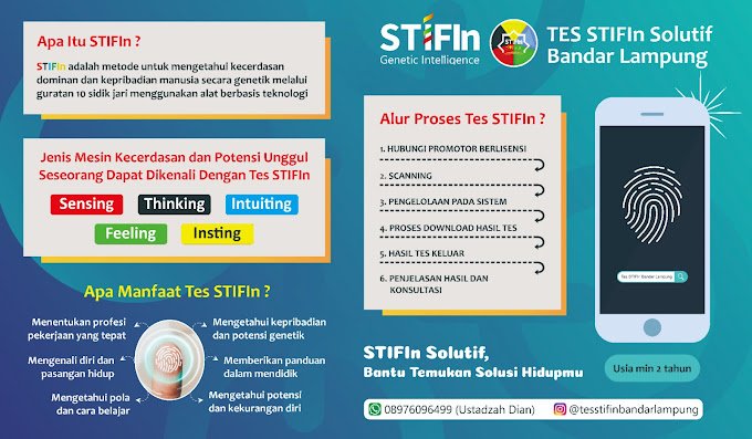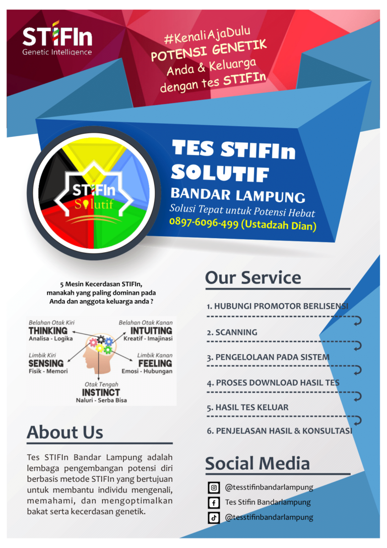 Tes STIFIn Solutif atau Tes STIFIn Bandar Lampung adalah lembaga pengembangan potensi diri berbasis metode STIFIn yang bertujuan untuk membantu individu mengenali, memahami, dan mengoptimalkan bakat serta kecerdasan genetik.